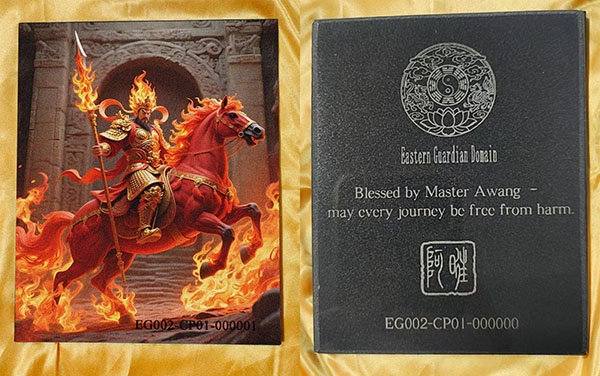 The EG002 Vehicle Guardian Plaque is consecrated under the protection of Lord Ma Wang, the ancient deity of speed and safe passage. Known as the guardian of travelers and riders, Ma Wang wards off accidents and unseen dangers on the road. Empowered by Master Awang’s ritual consecration, this sacred plaque shields your journey and ensures safe travels.