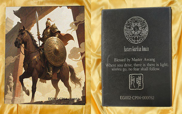 The EG002 Vehicle Guardian Plaque is consecrated under the protection of Lord Ma Wang, the ancient deity of speed and safe passage. Known as the guardian of travelers and riders, Ma Wang wards off accidents and unseen dangers on the road. Empowered by Master Awang’s ritual consecration, this sacred plaque shields your journey and ensures safe travels.