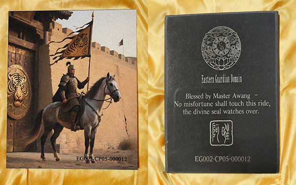 The EG002 Vehicle Guardian Plaque is consecrated under the protection of Lord Ma Wang, the ancient deity of speed and safe passage. Known as the guardian of travelers and riders, Ma Wang wards off accidents and unseen dangers on the road. Empowered by Master Awang’s ritual consecration, this sacred plaque shields your journey and ensures safe travels.